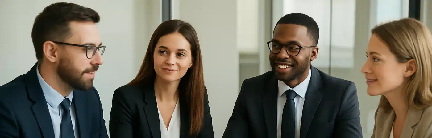 Group of business employees smiling in a meeting
